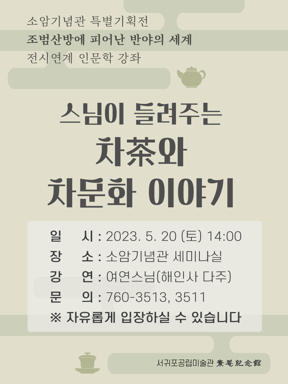 서귀포시 관계자는“소암기념관에서 현재 진행되고 있는 ‘조범산방에 피어난 般若반야의 향기’와 5월 부처님 오신 날을 맞아 특별히 ‘스님이 들여주는 차茶와 차문화 이야기’라는 주제로 강좌를 준비했다”며 “불교에서는‘선다일미禪茶一味’라 하여 수행하는 것과 차를 마시는 것은 같은 의미로 여기는 만큼 전시 감상과 함께 강좌를 듣는다면 더욱 뜻깊은 경험이 될 것”이라고 기대를 전했다.