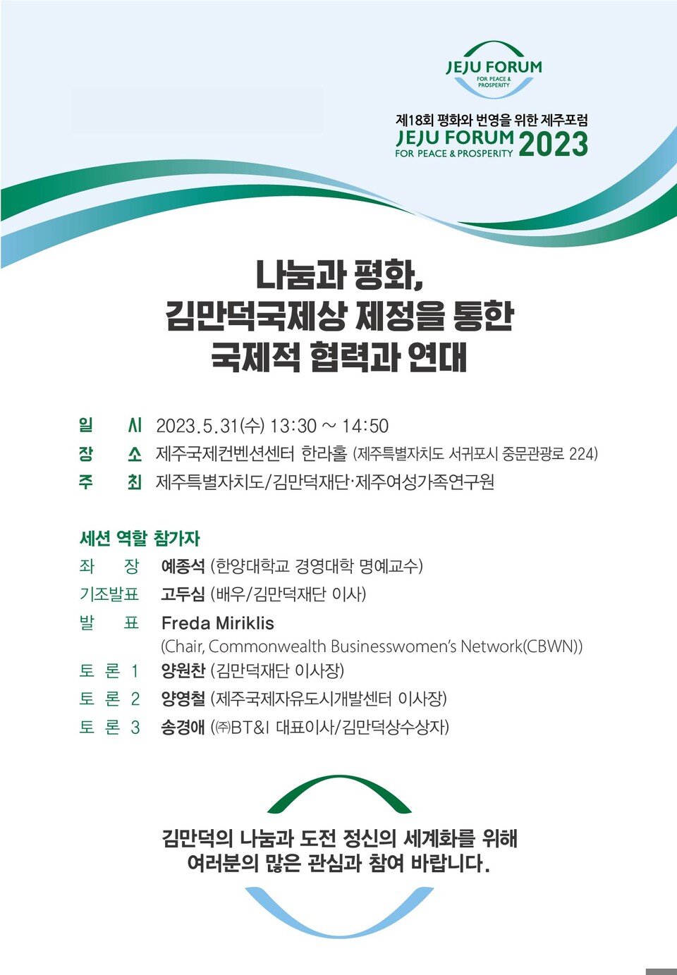 그 중 ICC JEJU 한라홀에서는 31일 세션 운영을 통해 ‘나눔과 평화, 김만덕국제상 제정을 통한 국제적 협력과 연대’라는 주제로 현재 제주도 조례로 추진 중인 김만덕상의 국제화 방안을 다룰 전망이다.