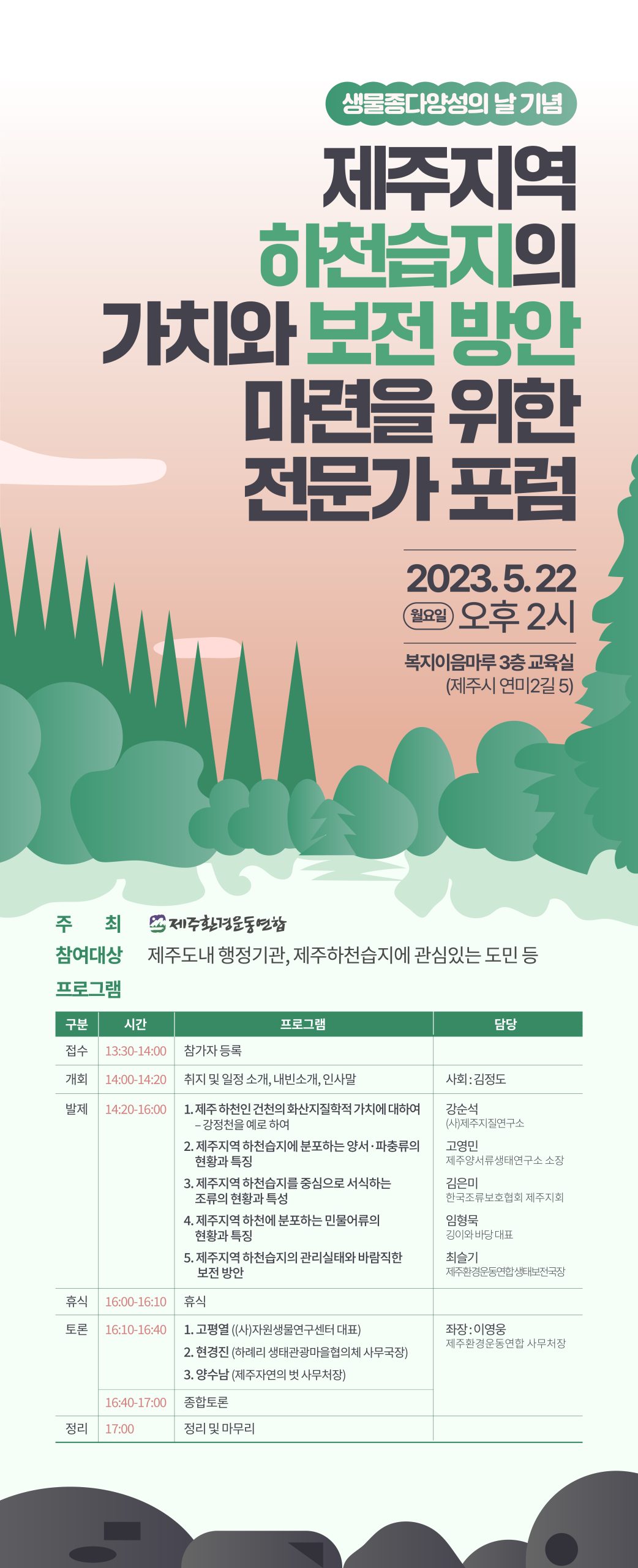 제주환경운동연합에서는 제주환경세계생물다양성의 날을 맞이하여 22일 오후 2시 복지이음마루에서 ‘제주지역 하천습지의 가치와 보전 방안 마련을 위한 전문가포럼’을 개최한다.