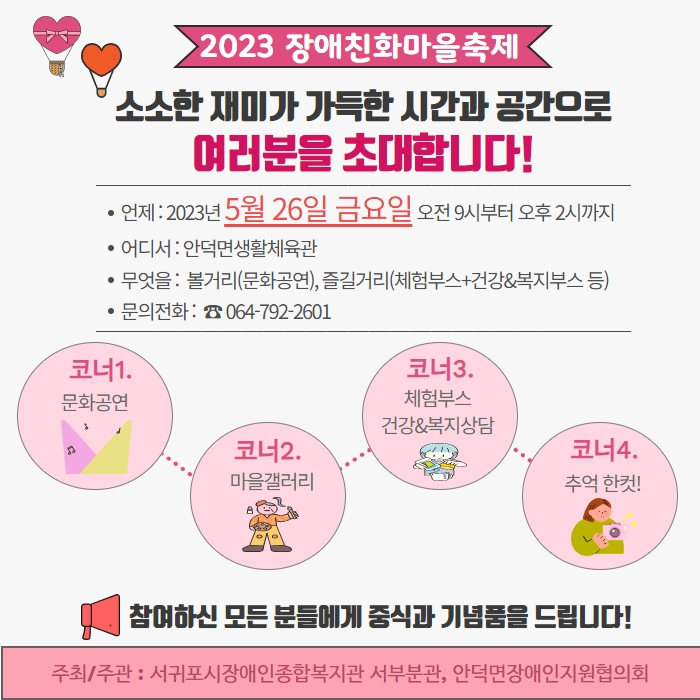 서귀포시장애인종합복지관(관장 윤보철) 서부분관은 26일 안덕생활체육관에서 '2023 장애친화마을축제'를 개최한다.