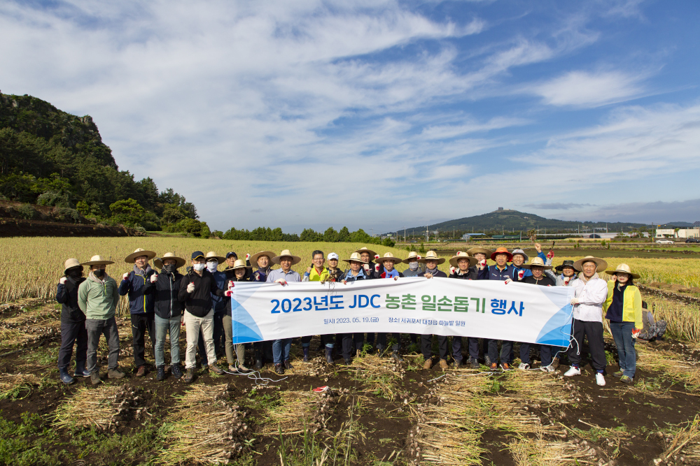 JDC 임원진과 각 부서장 등 간부로 구성된 자원봉사단 25여명은 본격적인 마늘수확기를 맞아 대정읍 일대 농가의 부족한 일손을 보태고 마늘을 직접 수확하며 농민들과 현장에서 소통했다.