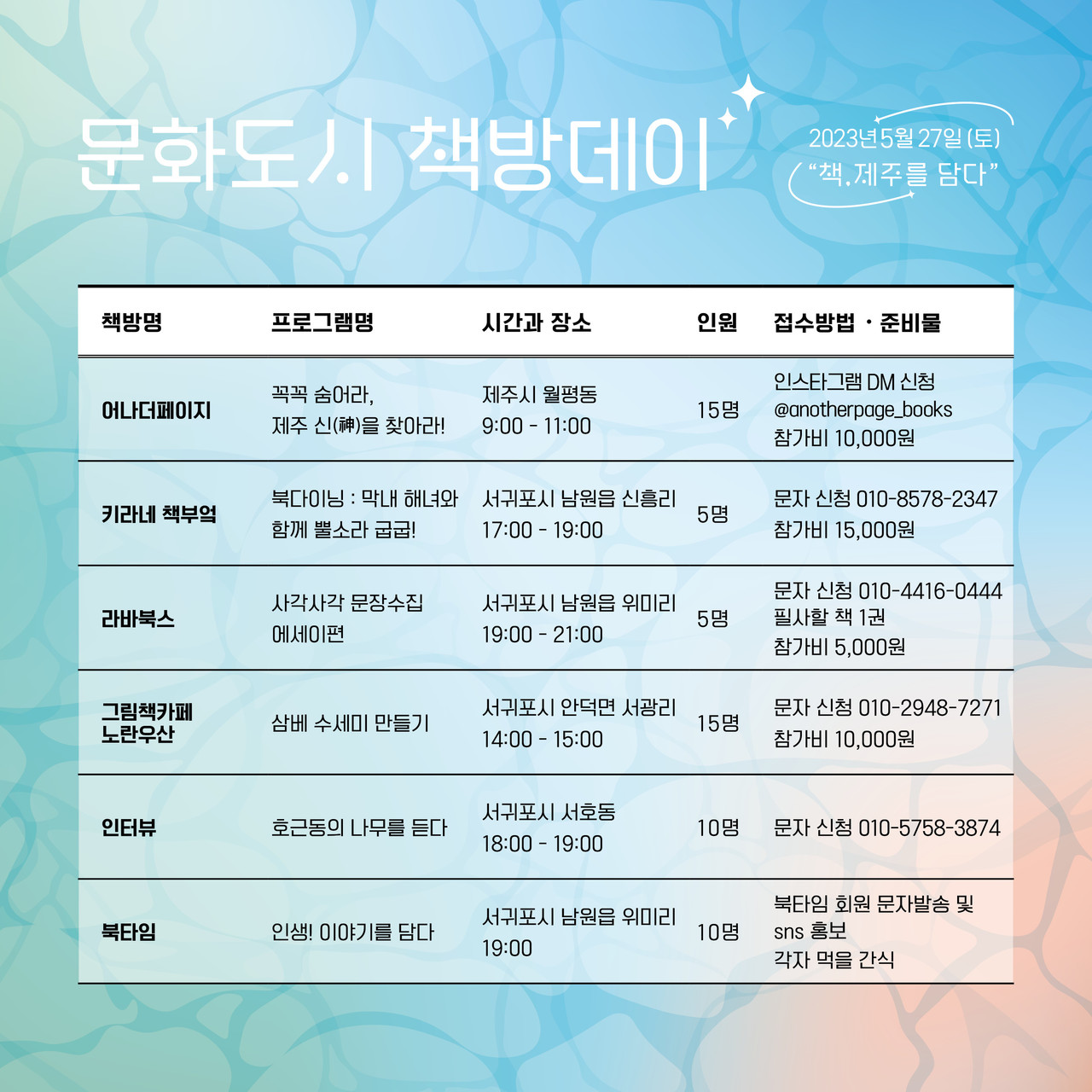 대정읍 하모리의 어나더페이지는 ‘제주, 당신을 만나다’를 집필한 홍죽희 작가와 함께 떠나는 신화 기행을 마련했다. 남원읍 위미리의 라바북스는 좋아하는 에세이를 가져와 이야기를 나누고 필사하는 시간을 준비했다. 남원읍 위미리의 북타임은 80세 이상 마을 어르신에게 듣는 마을에서 살아온 인생 이야기를 듣는 시간을 마련했다.