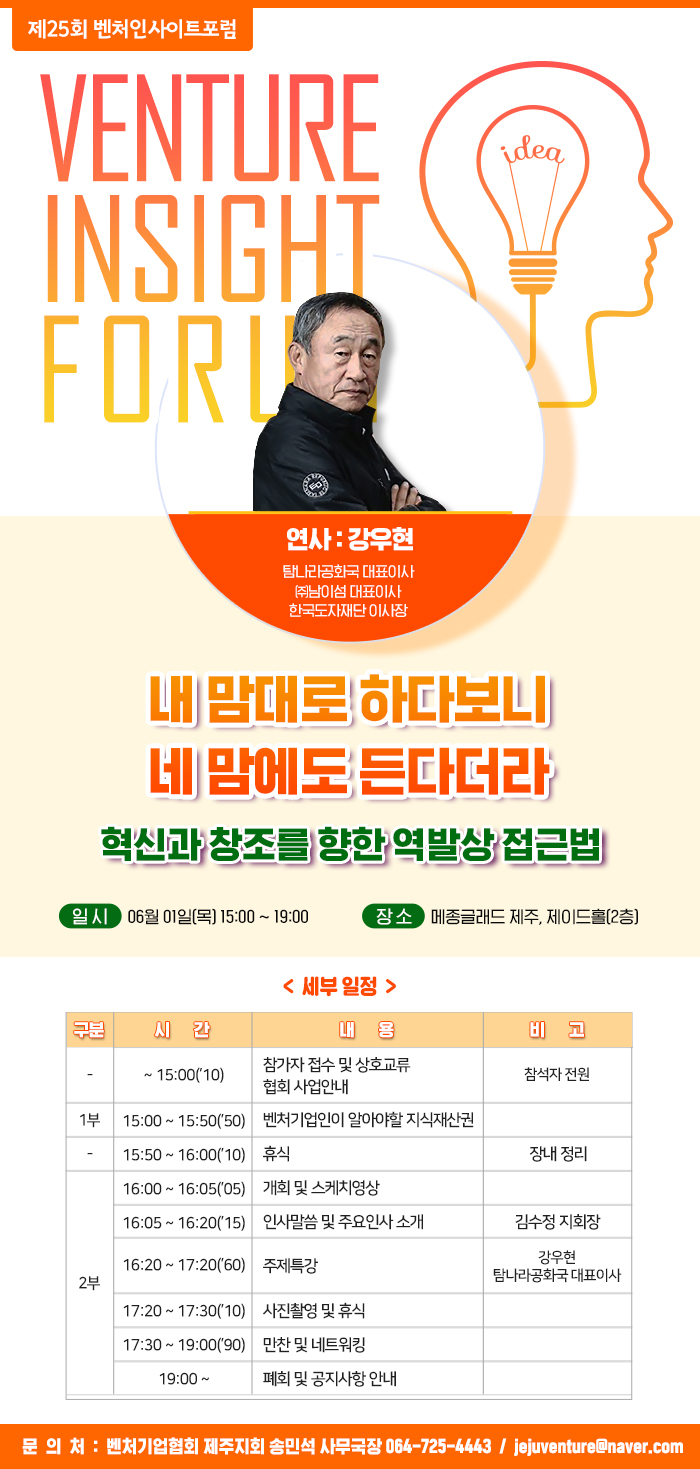 이번 포럼은 1일 오후 3시부터 7시까지 메종글래드 제주, 제이드홀(2층)에서 진행된다. 이날 탐나라 상상그룹의 강우현 회장이 혁신과 창조를 향한 역발상 접근법에 관한 특강을 진행할 예정이다.