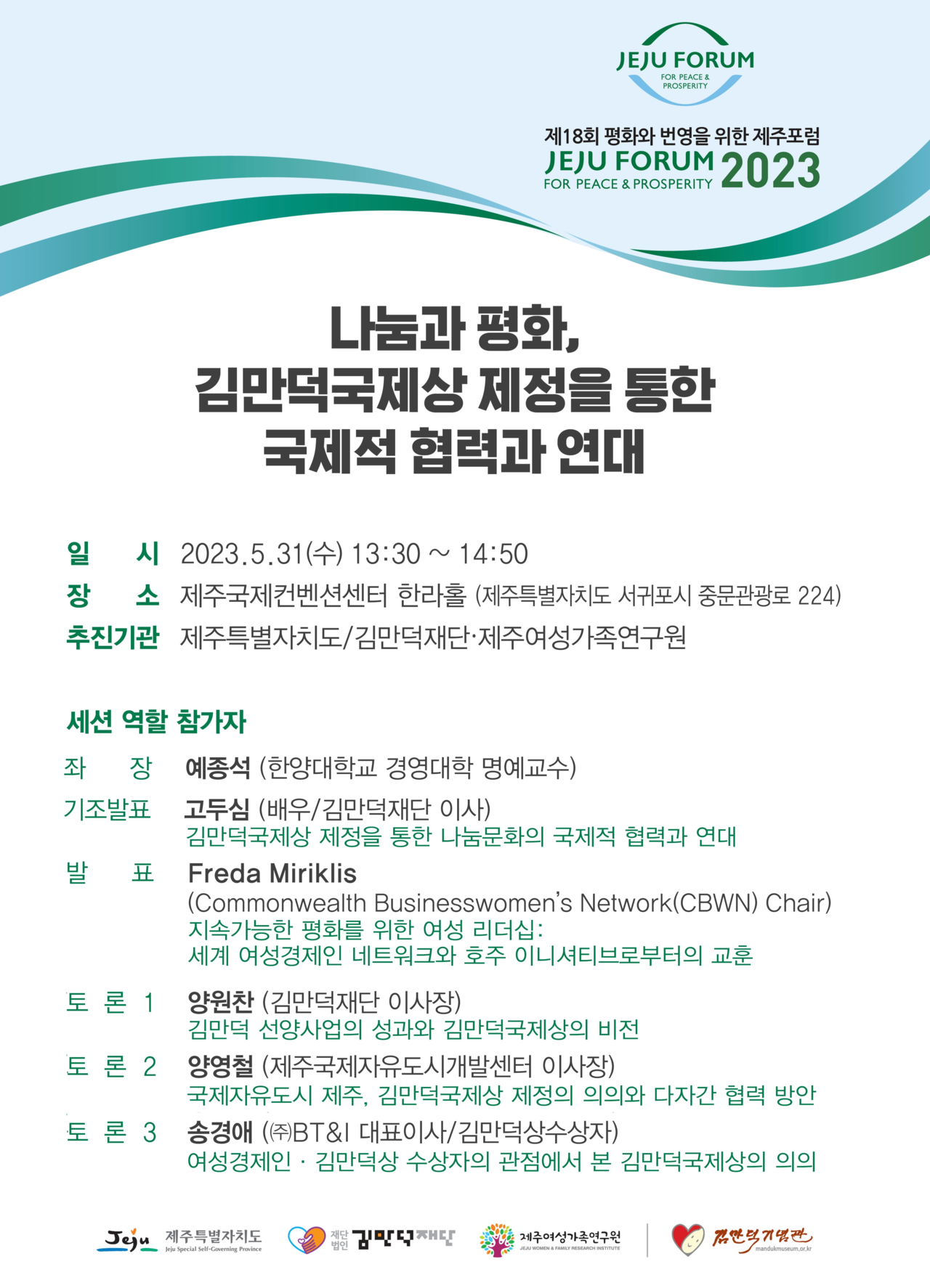 제주특별자치도와 김만덕재단(이사장 양원찬), 제주여성가족연구원(원장 문순덕)이 주최하는 제18회 제주포럼에서 5월 31일 오후 1시 30분 제주국제컨벤션센터 한라홀에서 대한민국 노블리스오블리제의 상징 김만덕과 ‘제주특별자치도 김만덕상’의 국제화를 모색하는 세션이 개최된다.