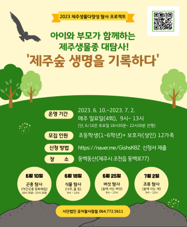 참가비는 무료며 가족 단위로 25명을 회차별로 선착순 모집한다. 초등학생과 부모가 짝을 이뤄야 참가가 가능하며, 신청은 6월 8일까지 받는다. 참가를 원하는 가족은 참가신청서를 곶자왈사람들 이메일로 보내면 된다. 생물다양성 탐사는 10인 내외 소규모로 팀을 이뤄 진행된다. 문의 772-5611.