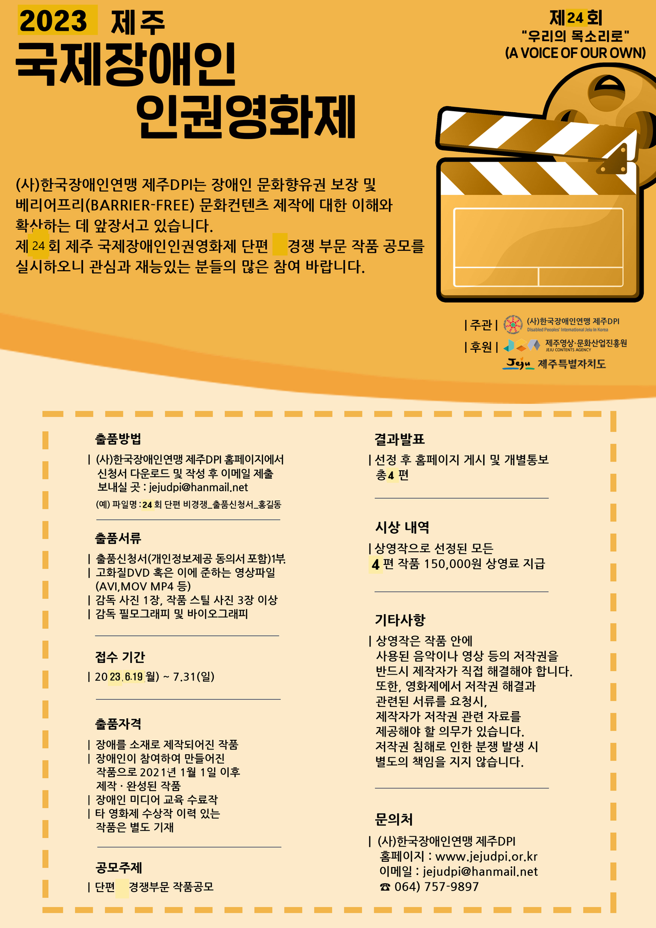 2000년도 전국에서 최초로 시작한 제주장애인인권영화제를 올해 개최하는데 있어서 제24회 제주국제장애인인권영화제 단편 경쟁 부문 작품 공모를 실시하오니 관심과 재능있는 분들의 많은 참여 바랍니다.
