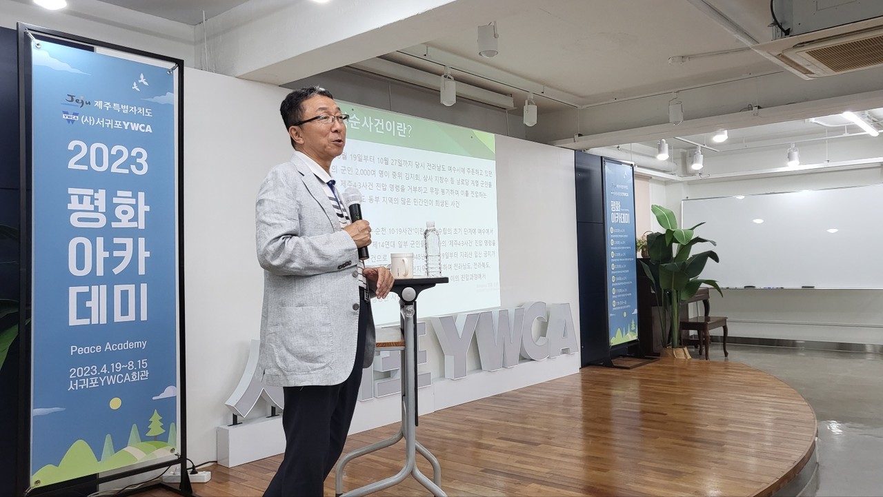 서귀포YWCA(회장 고맹수)는 제주특별자치도 주최로 ‘2023년 평화아카데미’ 4강좌를 20일 오후 2시 서귀포YWCA회관에서 도민 40여명을 대상으로 개최했다. 4강좌는 ‘[평화&역사] 제주4.3과 여순10.19’을 주제로 박찬식(제주도민속자연사박물관)관장이 진행했다. 강의는 제주4.3과 여순10.19를 비교하며 사건의 배경부터 역사적인 이해가 가능하도록 흐름을 설명했다.