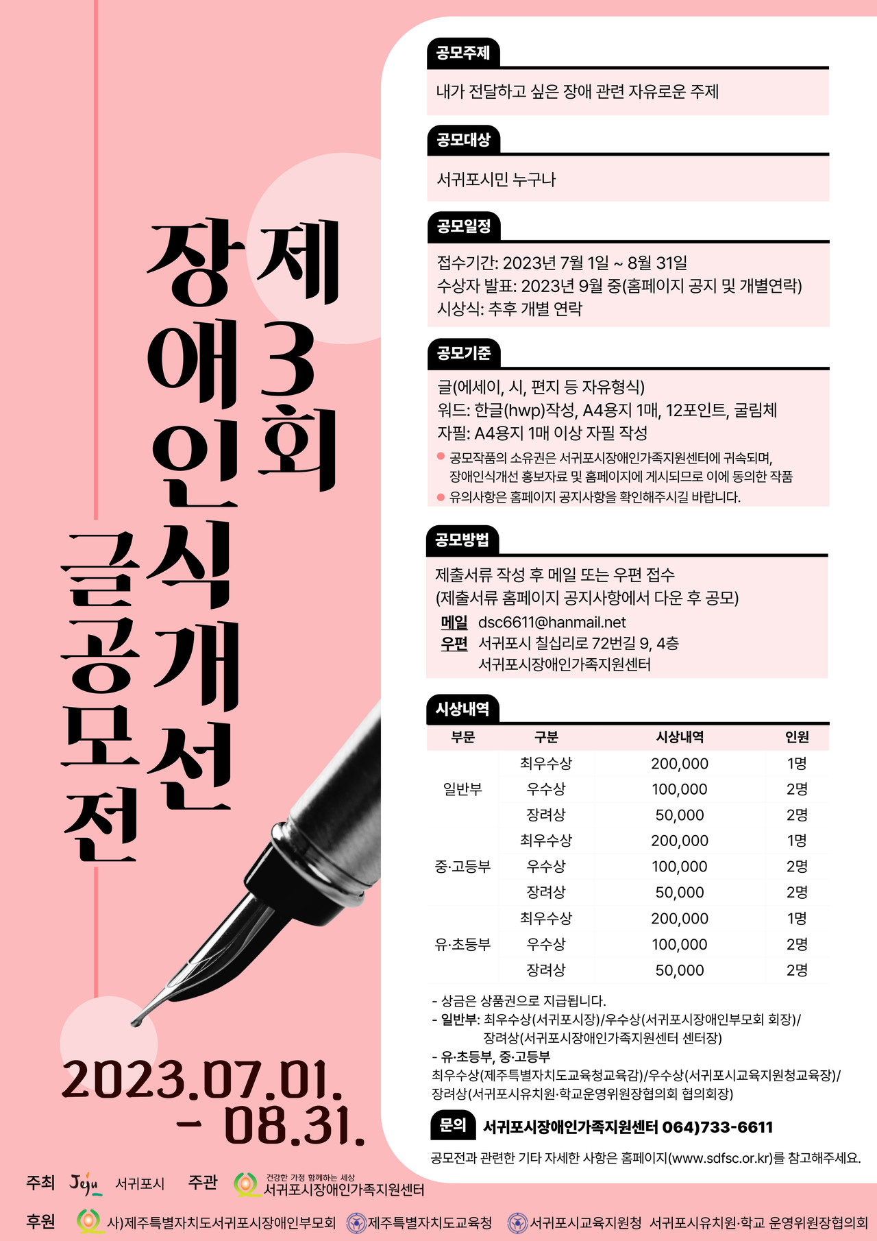 서귀포시장애인가족지원센터에서는 '제 3회 장애인식개선 사진/영상 공모전'을 개최한다. 접수기간은 7월 1일~8월31일이며 공모 글은 에세이, 시, 편지 등 자유형식이면 된다. 공모주제는 내가 전달하고 싶은 장애 관련 자유로운 주제로, 서귀포 시민이면 누구나 공모 가능하다. 문의 서귀포시장애인가족지원센터 733-6611.