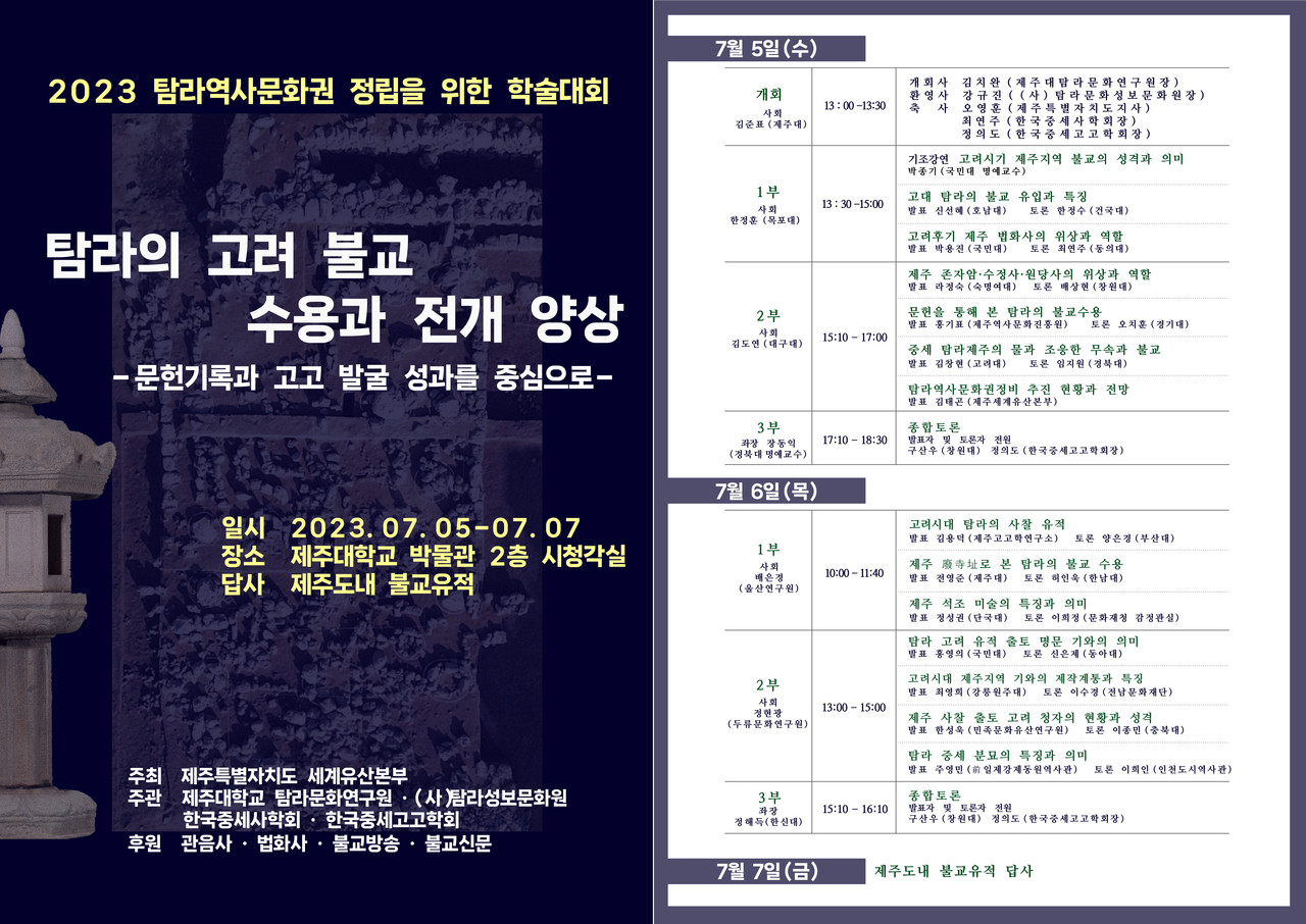 이번 학술대회는 7월 5일 한국중세사학회를 중심으로 기조강연 △고려시기 제주지역 불교의 성격과 의미(박종기, 국민대 명예교수) △고대 탐라의 불교 유입과 특징(신선혜, 호남대) △고려후기 제주 법화사의 위상과 역할(박용진, 국민대) △제주 존자암‧수정사‧원당사의 위상과 역할(라정숙, 숙명여대) △문헌을 통해 본 탐라의 불교수용(홍기표, 제주역사문화진흥원) △중세 탐라제주의 물과 조응한 무속과 불교(김창현, 고려대) △탐라역사문화권정비 추진 현황과 전망(김태곤,제주세계유산본부) 등 7주제의 발표가 이루어질 예정이다. 발표가 끝난 뒤 장동익(경북대 명예교수)이 좌장을 맡아 종합토론을 진행한다.