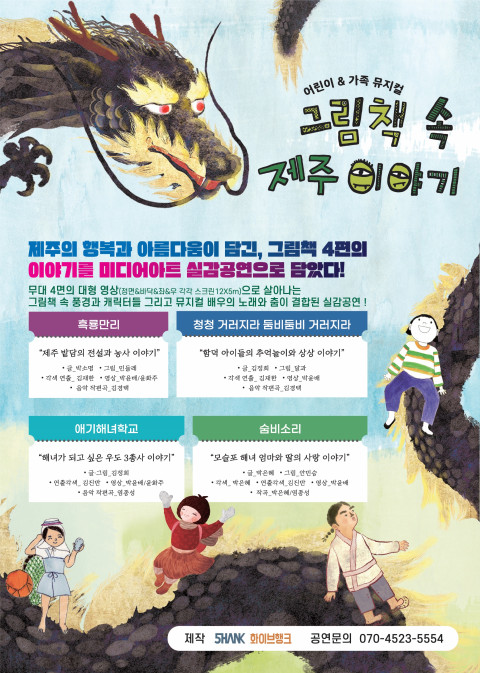 ‘실감공연 그림책속 제주 신화 이야기’는 제주 무형문화재인 ‘굿’과 ‘신화’ 이야기다. 제주 무형문화의 아름다움과 원초적 힐링 에너지를 뮤지컬, 영상 미디어, 일러스트가 융합된 실감공연으로 담았다. 2023년 10월 11일부터 27일까지 제주영상·문화산업진흥원 비인(BeIN;)극장에서 유료 쇼케이스 공연으로 처음 선보일 예정이다.
