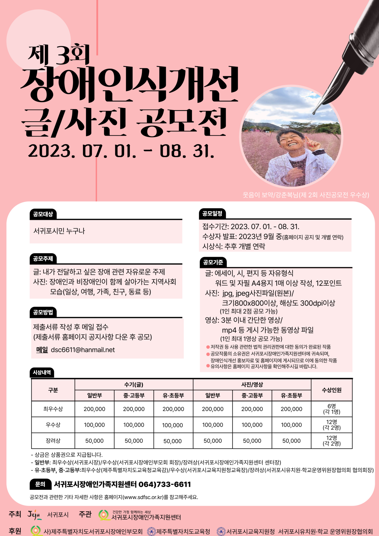 '장애인식개선 공모전'은 글, 사진(영상) 2가지 분야로 진행되며, 작품 접수 기간은 7월 1일부터 8월 31일까지로 장애인식개선 자유주제에 관심이 있는 서귀포 시민이라면 누구나 참여가 가능하다.