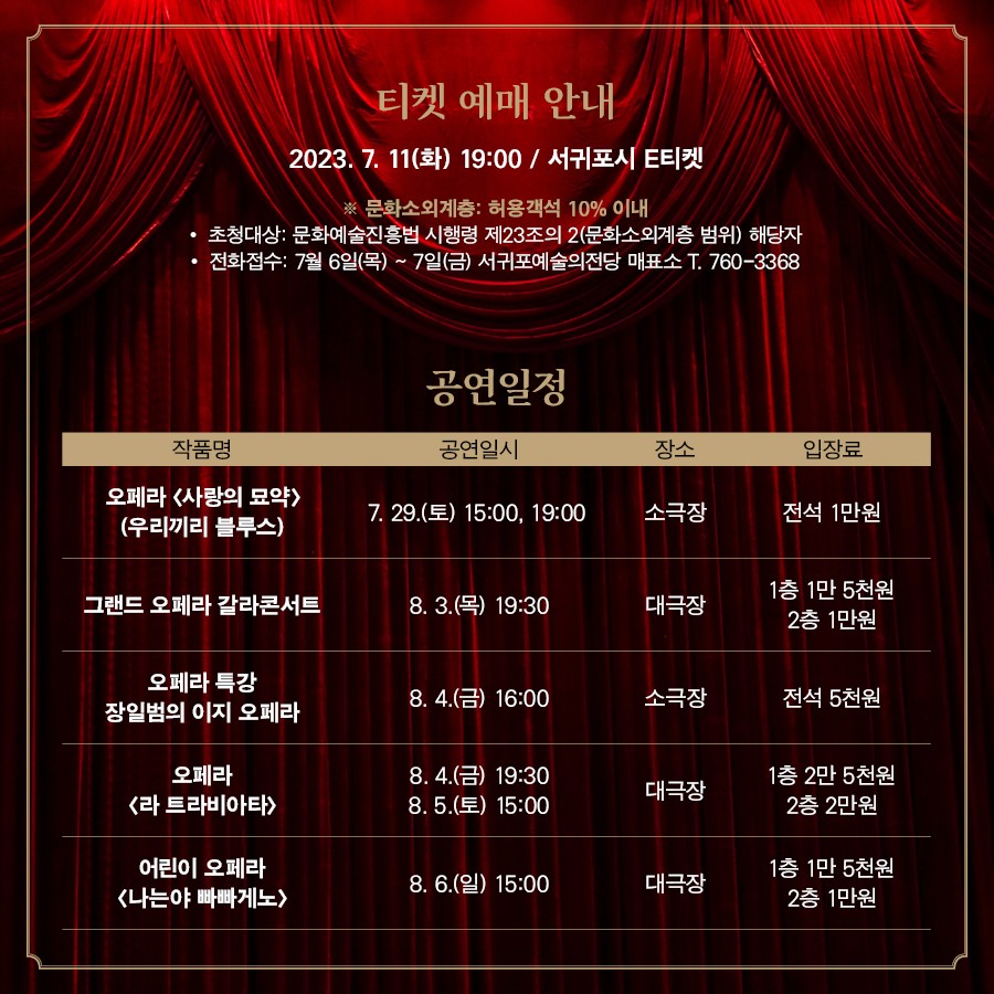 일반 관람권 예매는 7월 11일 오후 7시부터 서귀포시 E-티켓에서 선착순 예매 가능하다. 서귀포예술의전당 공연기획팀 문의 760-3368.