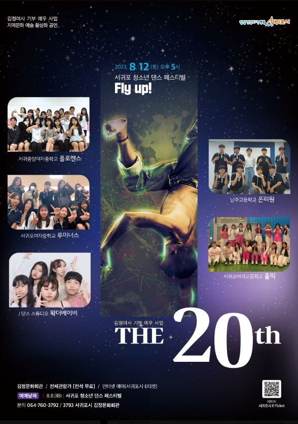 서귀포시는 김정여사 기부 20주년을 맞아 김정 여사 기부 예우사업의 일환으로 지역 문화예술 활성화 공연 시리즈 두 번째 공연 ‘서귀포 청소년 댄스 페스티벌 <Fly up>’을 8월 12일 오후 5시 김정문화회관 공연장에서 개최한다.