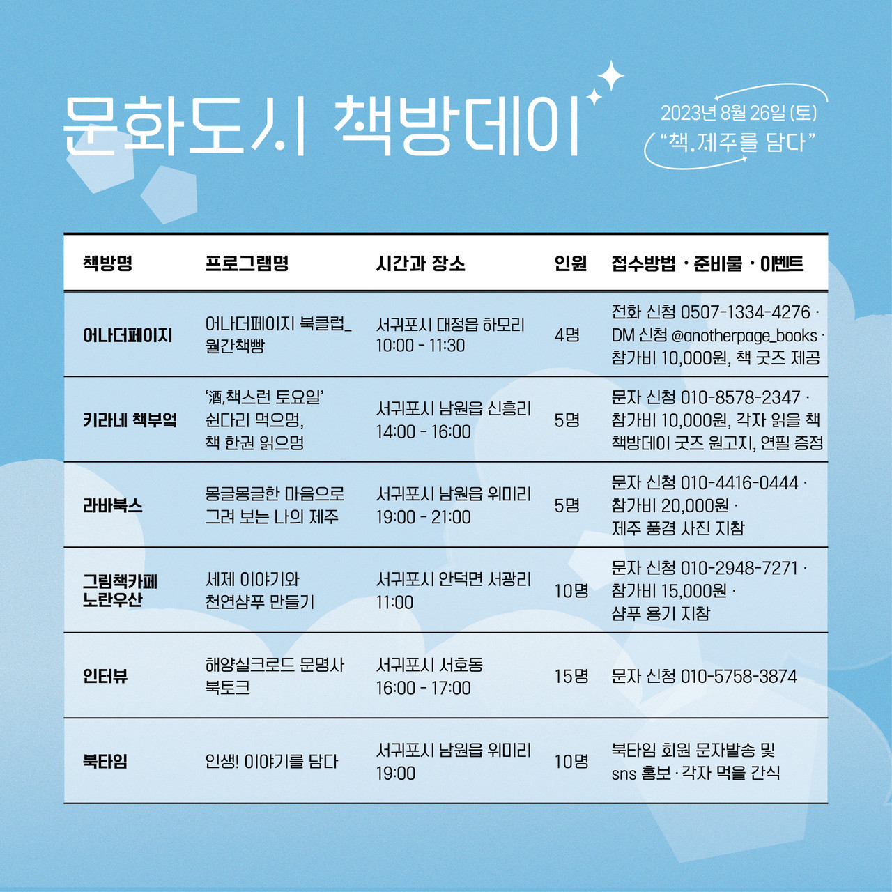 서귀포시문화도시센터 이광준 센터장은 “작년 책방데이에 이어, 올해 책방데이에도 다양한 제주의 계절, 환경, 음식, 문화를 담으려고 하고 있다”며 “서귀포 책방별 제주의 다양한 주제의 프로그램이 준비되고 있으니 많은 참여를 부탁드린다”고 밝혔다. 문의 767-9505.