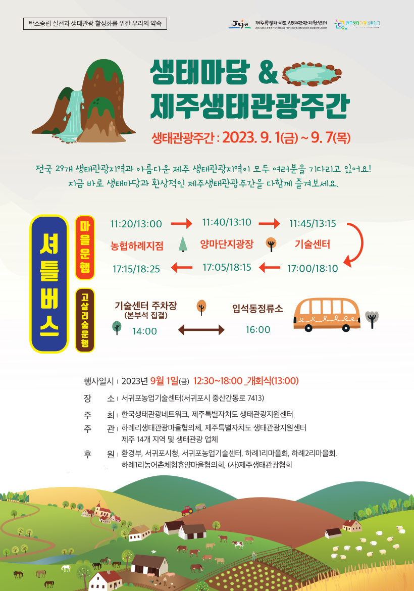 이번 2023 생태마당은 일주일 동안 도내 곳곳의 생태관광지와 생태관광 마을에서 생태관광 프로그램이 열리는 ‘생태관광주간’과 함께 행사가 열린다.