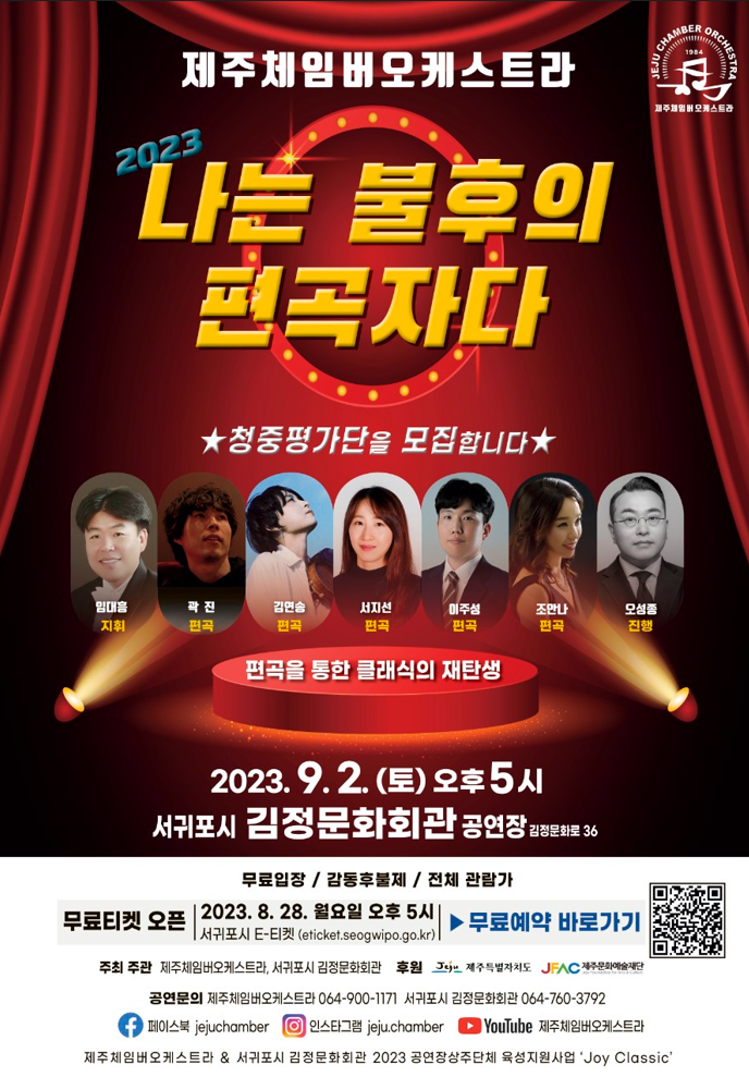 서귀포시는 2023년 공연장 상주단체 육성지원 사업의 기획공연으로 제주체임버오케스트라의 ‘2023 나는 불후의 편곡자다’ 공연을 오는 9월 2일 오후 5시 김정문화회관 공연장에서 개최한다.