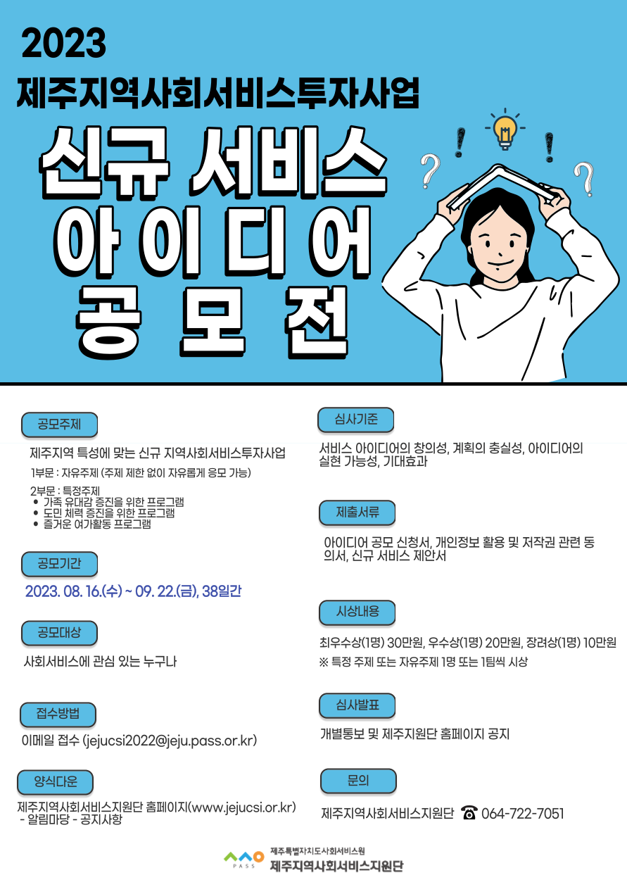 (재)제주특별자치도사회서비스원 산하 제주지역사회서비스지원단(단장 김혜란)이 제주지역사회서비스투자사업 신규 서비스 아이디어를 공모 중에 있다.