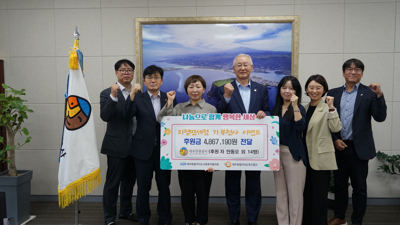 제주관광공사 중문면세점(이하 JTO중문면세점, 사장 고은숙)은 26일 제주웰컴센터에서 추석을 앞두고 도내 어려운 이웃을 위한 따뜻한 나눔 활동에 동참하고자 ‘기부천사 이벤트’로 모금된 기부금 486만7,190원을 제주특별자치도사회복지협의회에 전달했다.