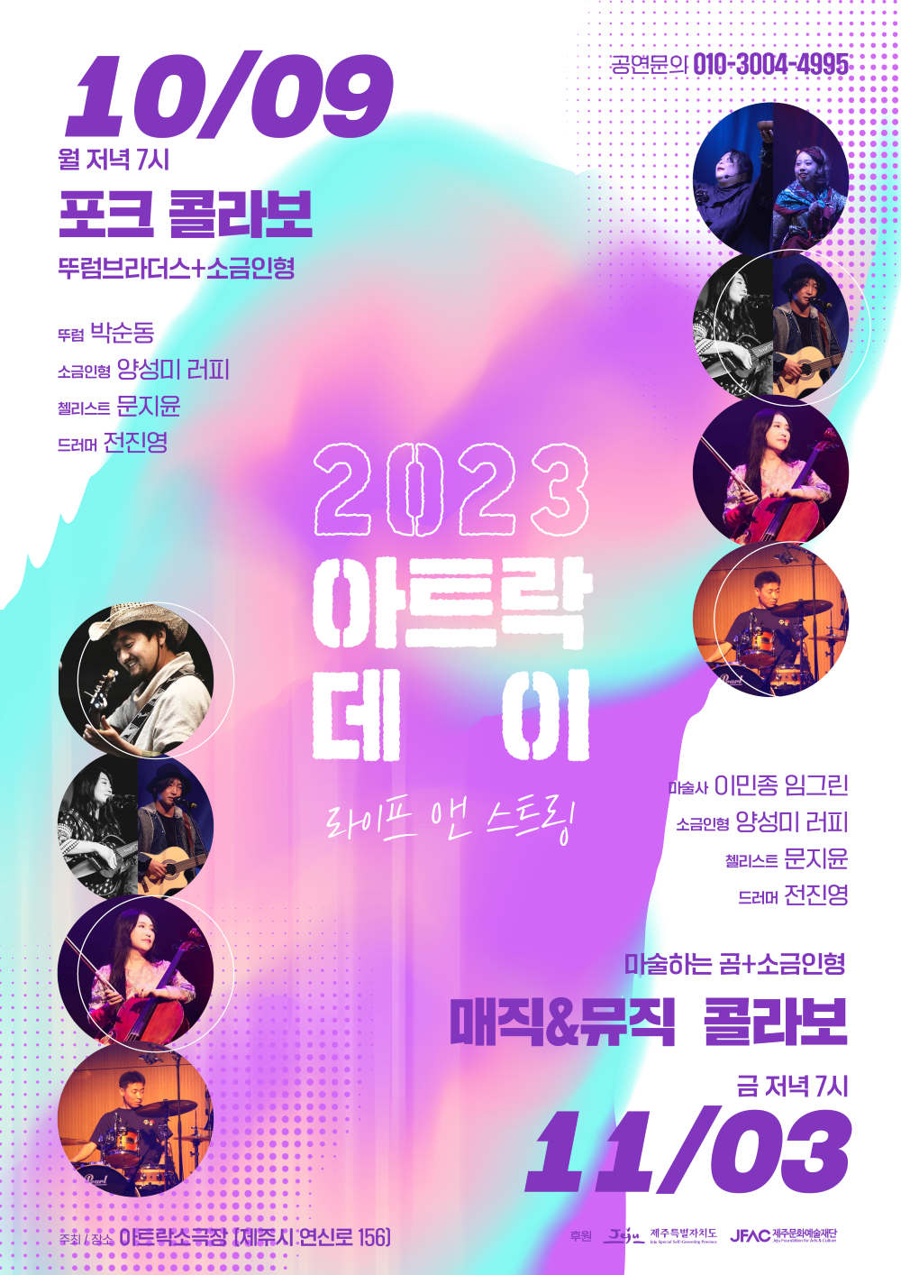 이번 아트락데이는 총 2회의 공연으로 진행되는데, 9일 오후 7시에 첫 번째 순서로 포크 콜라보 데이에는 제주어 지킴이 뚜럼브라더스와 인디밴드 소금인형의 콜라보 무대가 열린다.
