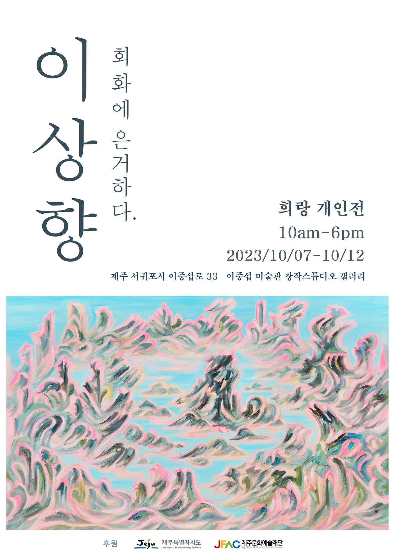 이번 전시는 작가가 제주의 숲과 바다에서 배운 삶에 대한 깨달음의 이야기를 담고 있다. 삶의 이치를 보여주는 자연의 장면들에서 영감을 받고, 심정을 경관에 담아 시각화하여 내면의 안식처로써의 산수를 그려내 잠시나마 회화에 은거할 수 있는 평화의 순간을 만들고자 한다.