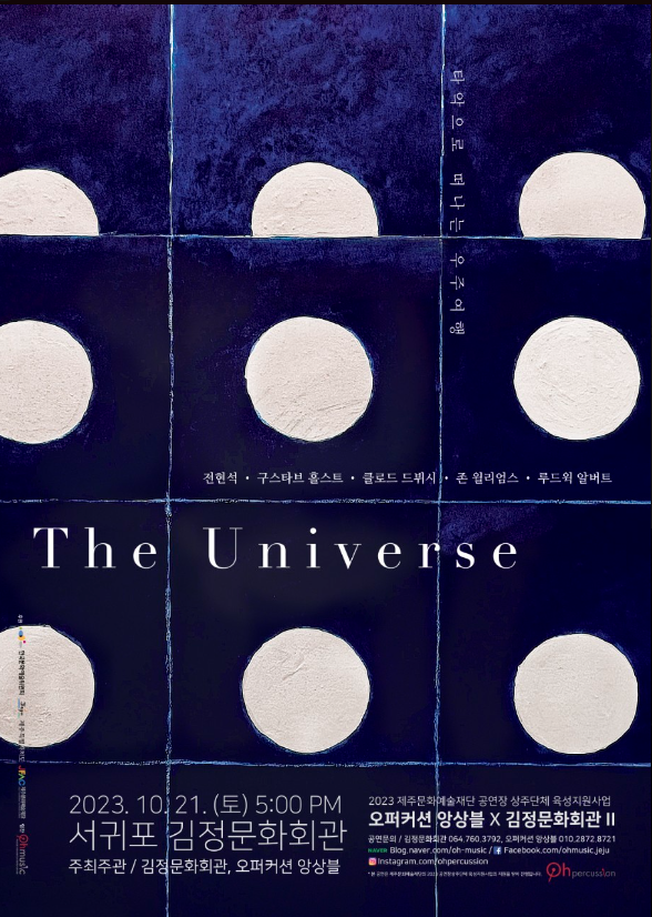 본 공연은 오퍼커션앙상블 대표 오승명의 지휘로 우리에게 익숙한 드뷔시 <달빛>, 존 윌리엄스의 영화 <‘스타워즈’ ost>와 구스타브 홀스트의 <행성 모음곡> op. 32, 루드윅 알버트의 <3대의 마림바를 위한 협주곡 ‘우주’> 외에도 위촉 초연곡인 전현석의 <Gravity Line for Purcussion Orchestra> 곡이 연주될 예정이다.