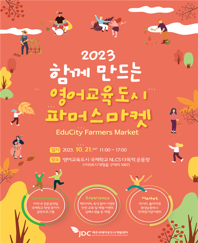 제주국제자유도시개발센터(이사장 양영철, JDC)는 오는 21일 서귀포시 영어교육도시 일대에서 ‘2023함께 만드는 영어교육도시 파머스 마켓’을 개최한다.