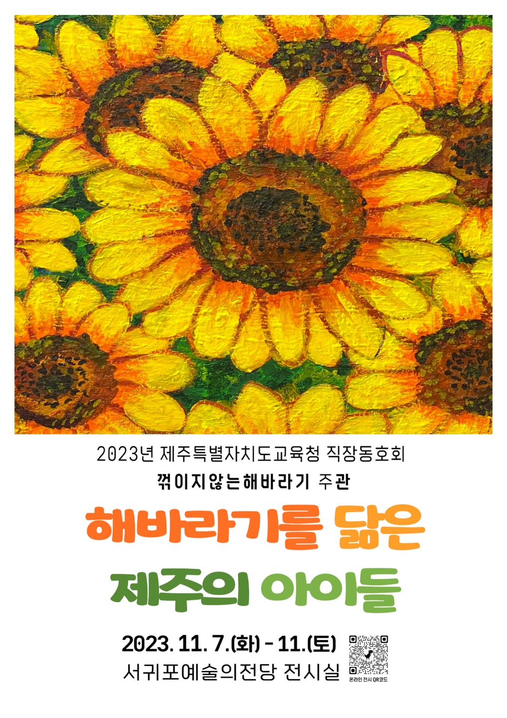 제주특별자치도교육청 직장동호회 '꺾이지않는해바라기(회장 황현철)'가 주관하는 <해바라기를 닮은 제주의 아이들> 展이 오는 11월 7일부터 11일까지 서귀포예술의전당 전시실에서 열린다.