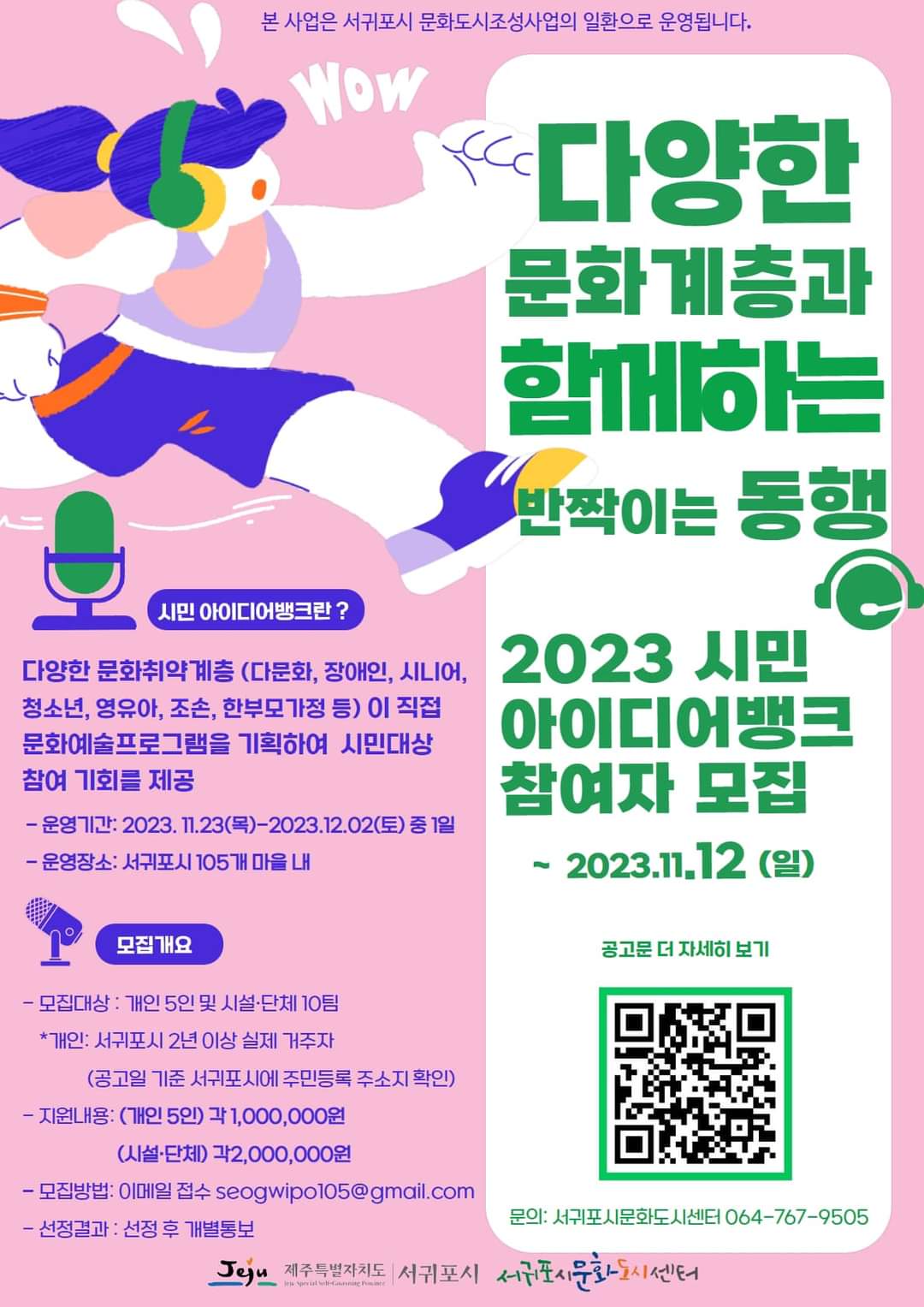 서귀포시문화도시센터(센터장 이광준)는 문화적 다양성 가치 실현을 위한 ‘2023 문화도시 시민아이디어뱅크, 반짝이는 동행’ 참여자를 오는 12일까지 모집 중이다.