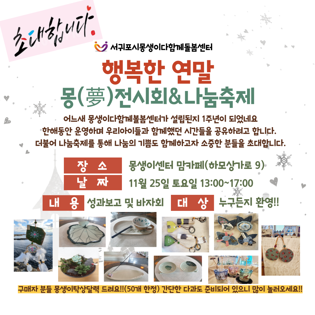 최남단대정읍마을관리협동조합(이사장 김은준) 서귀포시몽생이다함께돌봄센터(센터장 윤정현)는 설립1주년을 맞아 이달 25일 토요일 오후1시~5시까지 몽생이센터 내 맘카페에서 몽(夢)전시회와 나눔축제를 운영한다.