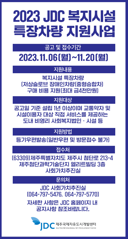 제주국제자유도시개발센터(이사장 양영철, JDC)가 도내 복지시설 특장차량 지원을 위한 공모를 실시한다.