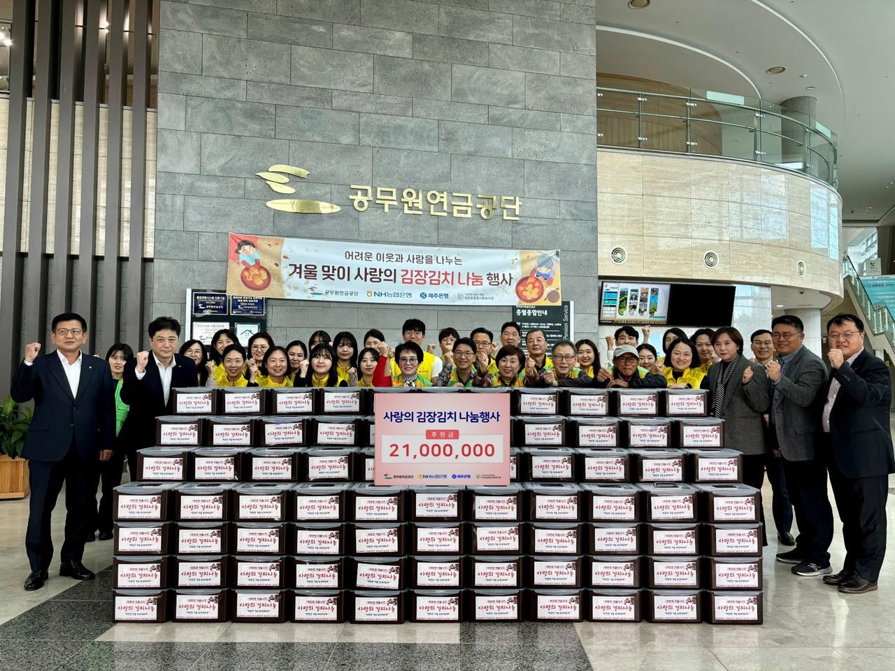 공무원연금공단(이사장 김동극)은 김장철을 맞아 14일 제주본사에서 어려운 이웃에 따뜻한 겨울을 선물하기 위한 ‘김장김치 나눔 행사’를 실시했다.