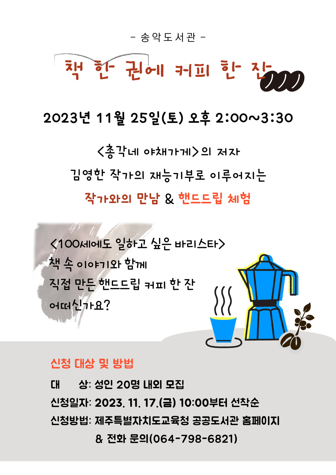 이번 작가와의 만남은 책과 관련된 이야기뿐만 아니라 핸드드립 체험하며 직접 만든 커피 한 잔과 함께 지역 주민들이 도서관에 모여 소통할 예정이다.
