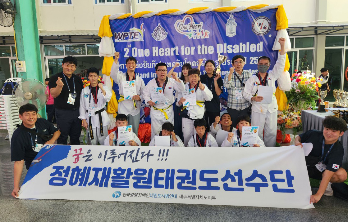서귀포 정혜재활원(원장 이홍기) 태권도 선수단이 ‘제2회 태국 한마음국제장애인태권도경연대회’에 참가해 태권체조 및 스피드발차기(단체) 종목에서 1위의 우수한 성적을 거두며 2관왕을 차지했다. 이 대회는 세계장애인태권도연맹이 주최했다.