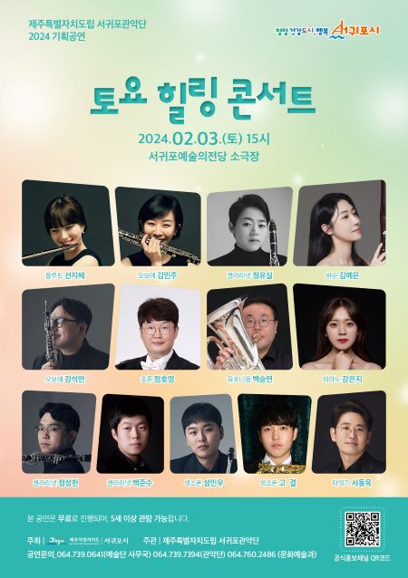 오는 2월 3일 서귀포예술의전당 소극장에서 개최하는 토요힐링콘서트는 서귀포시(시장 이종우)와 제주특별자치도립 서귀포관악단이 기획해 지난 1월 13일 첫 번째 공연을 시작으로 6월까지 매달 1회 진행되는 특별 기획공연이다.