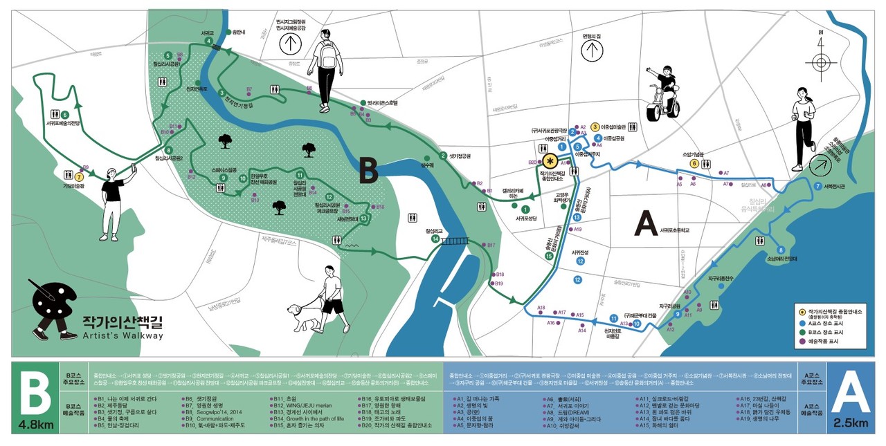 2023년 브랜딩 사업을 시작으로 새단장을 준비해온 작가의 산책길은 현재 코스 재설계와 작가의 산책길을 잘 드러낼 수 있는 BI개발을 마치고 이에 표지 안내시설물을 단일 방향으로 하여 순환 코스를 잘 둘러볼 수 있도록 전면 교체 완료했다. B코스 서귀포칠십리시공원 내 스페이스칠공(구 유토피아갤러리) 또한 지난해 9월 개축 공사를 완료하고, 올해 2월부터 기획전시를 시작으로 생활 속 문화공간으로 선보일 예정이다.