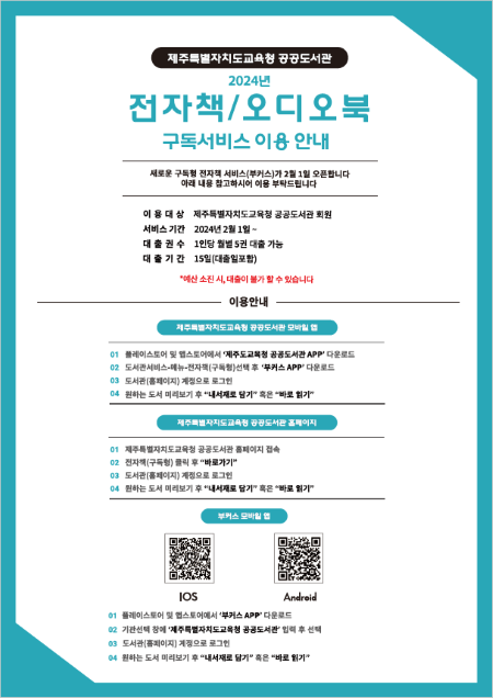 제주특별자치도교육청 공공도서관은 지역의 책 읽는 문화 확산을 위해 지역주민들이 다양한 독서콘텐츠를 이용할 수 있도록‘구독형 전자책 서비스’를 오는 2월 1일부터 시행한다고 밝혔다.