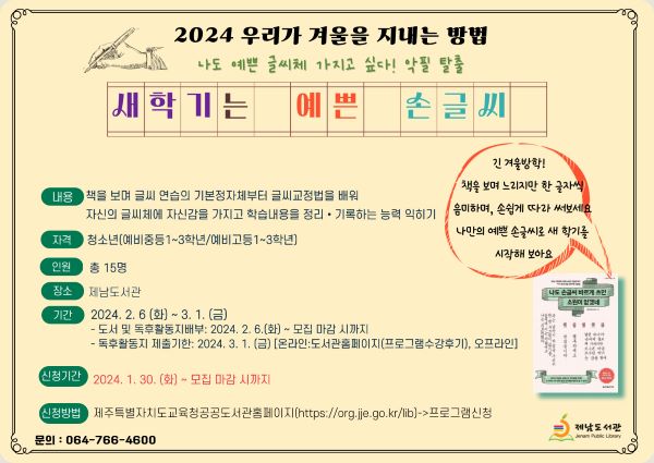 제남도서관(분관장 진승미)은 지역 청소년을 대상으로 2024년‘우리가 겨울을 지내는 방법 – 새학기는 예쁜 손글씨’ 참가자를 모집한다.