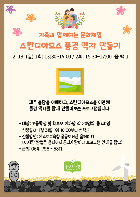 오는 2월 18일 가족과 함께하는 문화체험 프로그램은 제주 돌담과 스칸디아모스를 테마로 한 풍경 액자 만들기로 진행된다.