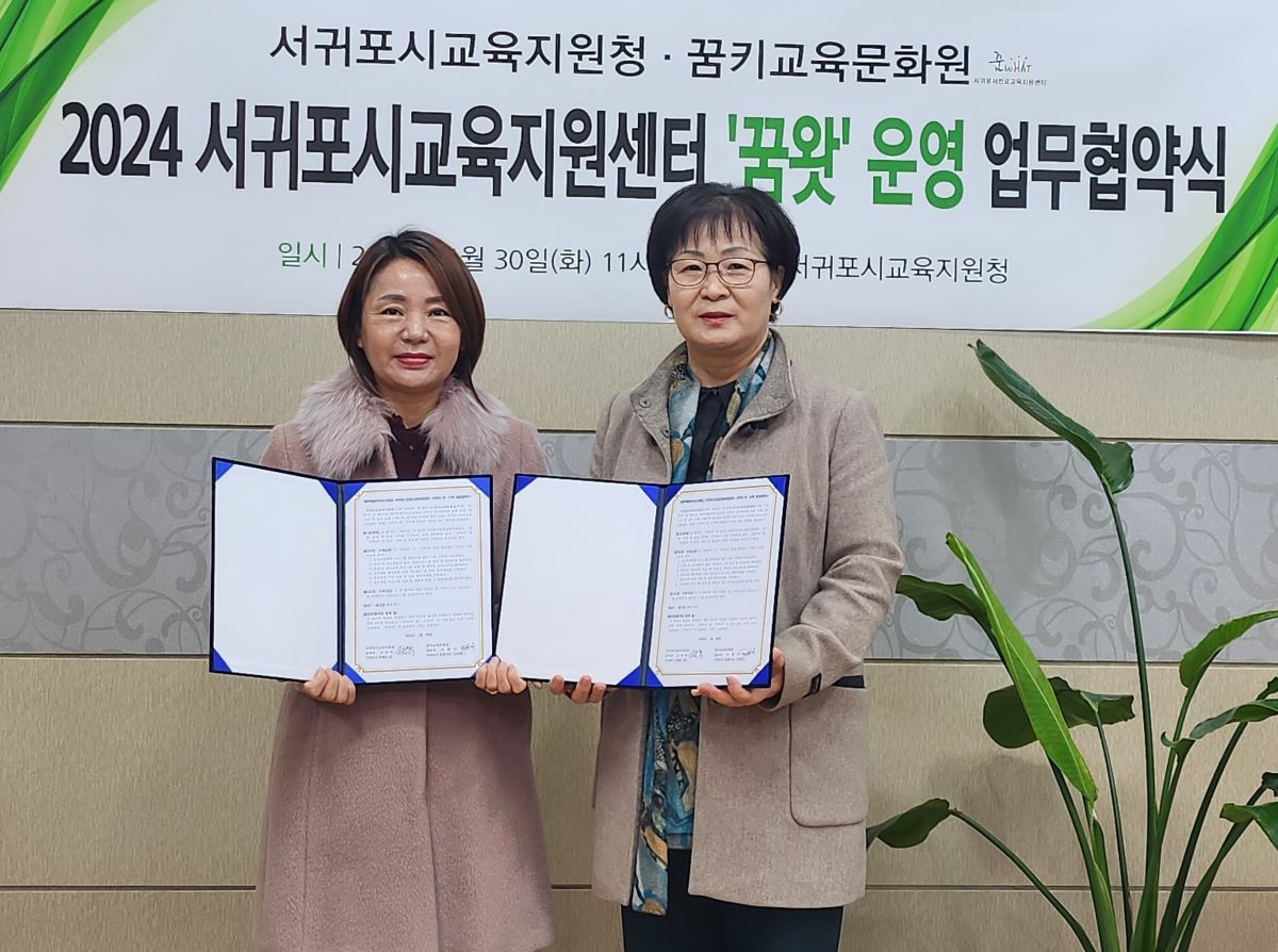 서귀포시교육지원청(교육장 고순옥)은 지난 30일 비영리법인 꿈키교육문화원(대표 이현미)과 서귀포시진로교육지원센터 운영을 위한 업무협약식을 진행했다고 밝혔다.