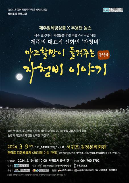 서귀포시 김정문화회관은 21일 2024년 공연장 상주단체 육성지원 사업의 첫 번째 기획공연으로 (사)제주빌레앙상블의 마고할망이 들려주는 ‘자청비 이야기’를 개최한다고 밝혔다.