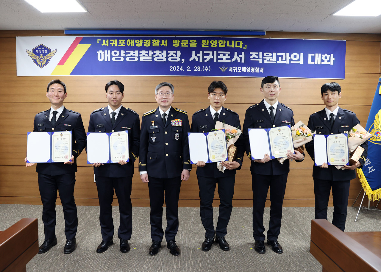 29일 서귀포해양경찰서에 따르면 김종욱 해양경찰청장은 지난 28일 서귀포서를 찾고 서귀포 해상에서 발생한 침몰선박 선원구조에 활약한 5002함 소속 조호준 경사를 직접 특별승진 임용했다.