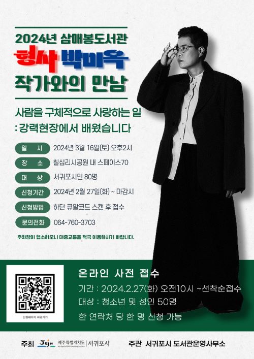 서귀포시 삼매봉도서관은 오는 3월 16일 오후2시 스페이스칠공(SPACE70)에서 지역주민들을 대상으로 작가와의 만남을 개최한다.