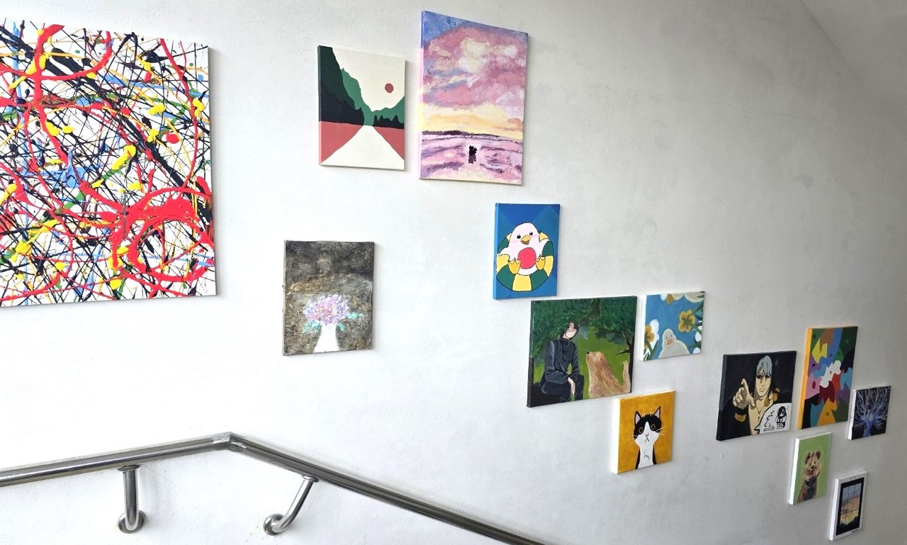 2층으로 오르는 계단 벽면에는 다양한 개성의 작품이 자리하고, 삭막해 보일 텅 빈 벽면에도 이들의 액션 페인팅 작품으로 활기를 더한다.