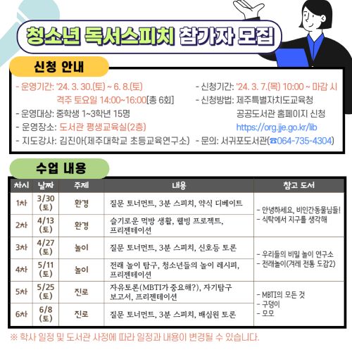 서귀포도서관은 6일, 중학생을 대상으로 한 ‘2024년 청소년 독서스피치’ 프로그램의 참가자를 모집한다고 밝혔다.