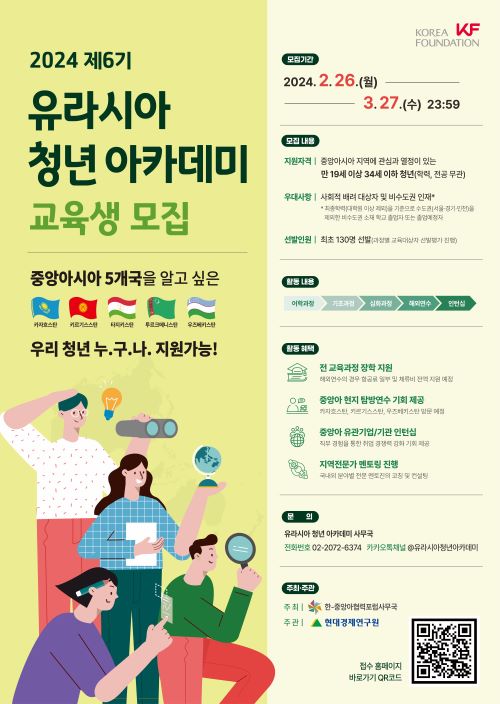 KF(Korea Foundation, 한국국제교류재단, 이사장 김기환) 한-중앙아협력포럼사무국은 ‘2024 유라시아 청년 아카데미’ 참가자를 오는 3월 27일까지 모집한다고 밝혔다.
