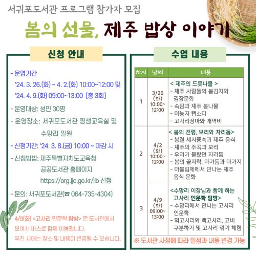 3월 26일, 4월 2일은 오전 10시부터 12시까지 도서관 평생교육실에서 이론 강의가 진행되고, 4월 9일은 오전 9시부터 오후1시까지 남원읍 수망리 일원에서 운영된다.