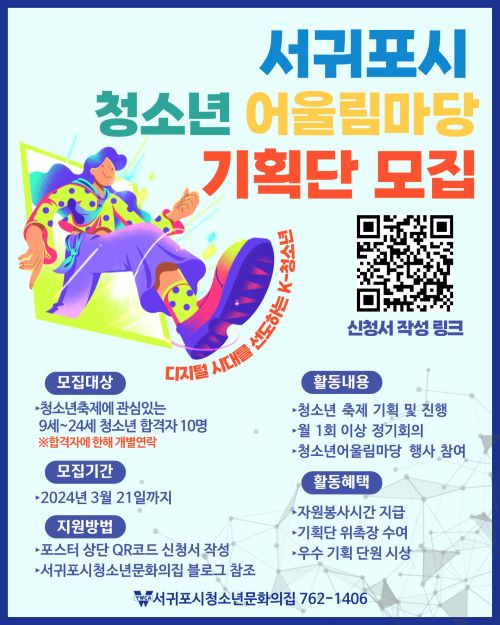 기획단으로 선정되면 2024서귀포시청소년어울림마당에 참여하게 된다. 이번 행사 주제는 ‘디지털시대를 선도하는 K-청소년'으로 드론 레이싱 대회, 진로직업 축제 등이 진행된다.