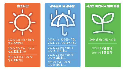 실제로 도농기원은 노지감귤의 경우 강수량 증가 등으로 인해 발아가 전년과 평년에 비해 빨라질 것으로 예상하고 서리피해를 주의할 것을 당부했다.