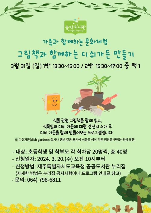 ㈜꼼지락 홍미옥 대표가 진행하는 ‘그림책과 함께하는 디쉬가든 만들기’는 3월 31일 오후 1시 30분과 3시 30분 각 회차당 20명씩 총 2회로 진행된다.