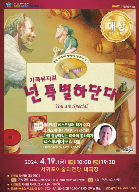 서귀포예술의전당은 20일 미국 베스트셀러 작가 맥스 루케이도의 원작을 바탕으로 한 가족 뮤지컬 ‘넌 특별하단다’를 개최한다고 밝혔다.